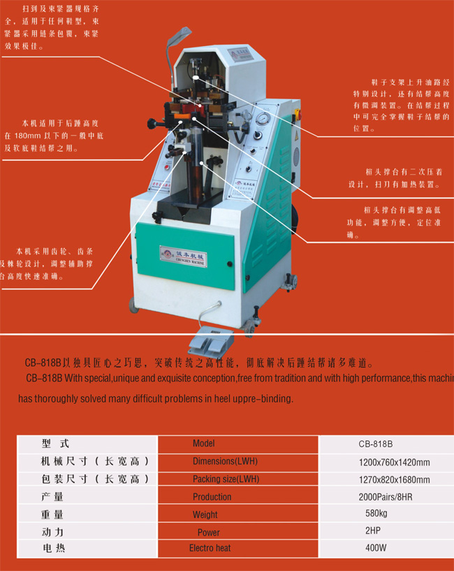 我們專業(yè)生產《CB-8188新型后踵結幫機》,我們擁有專業(yè)的技術生產團隊,經驗豐富,我們的主要產品還包括:,請記住我們的網址:http://m.lediaoquan.cn/!